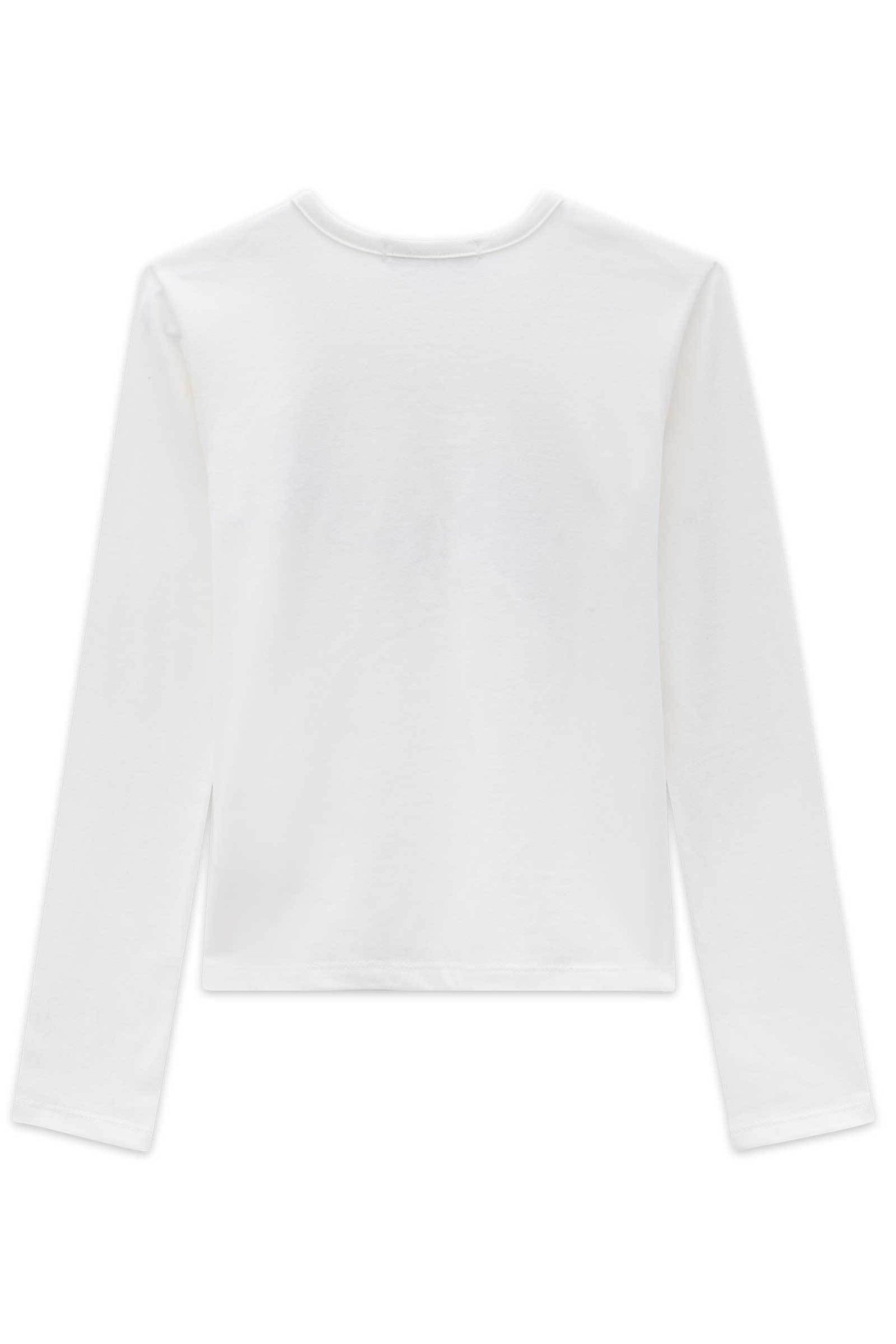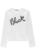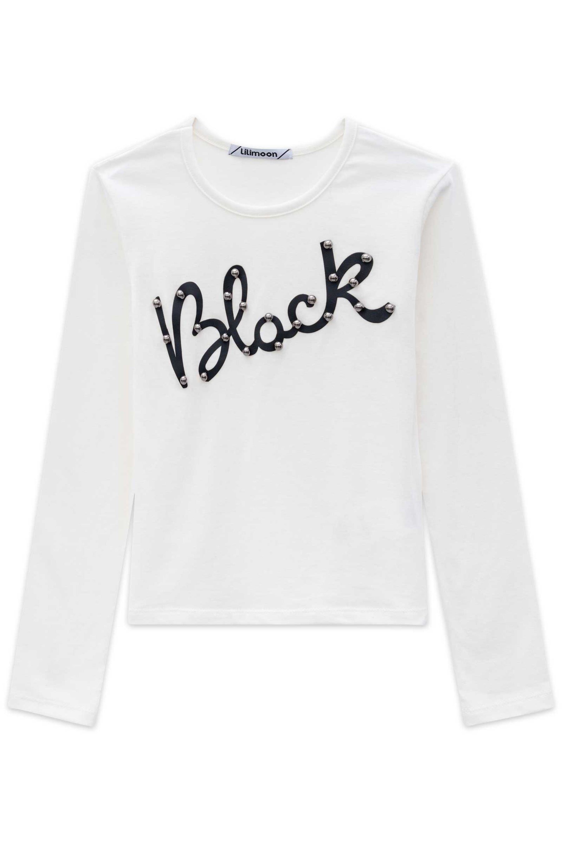- Cream-colored long-sleeved t-shirt with eco-leather and bead print.