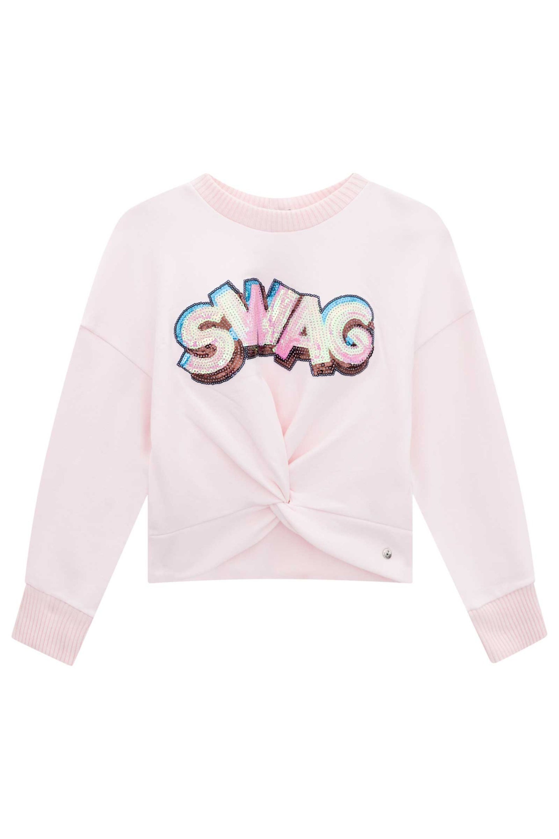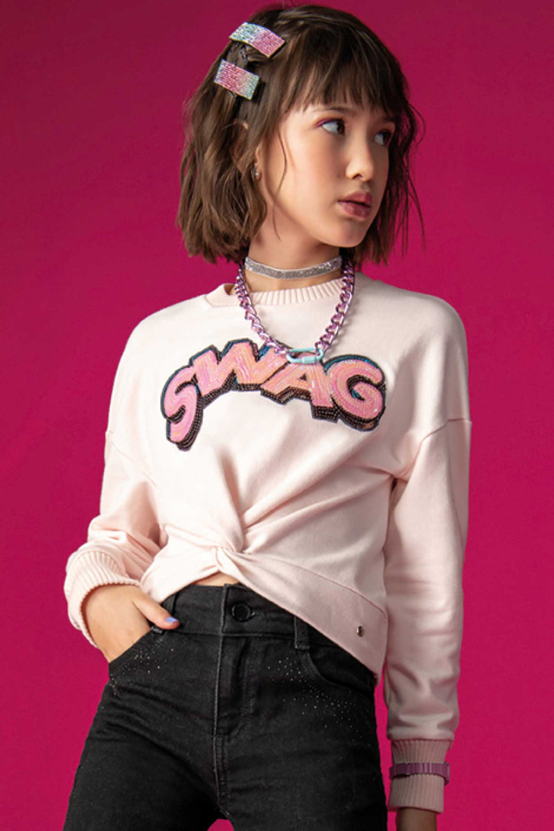 Pink fleece sweater with ''SWAG'' sequins and bow at the bottom.