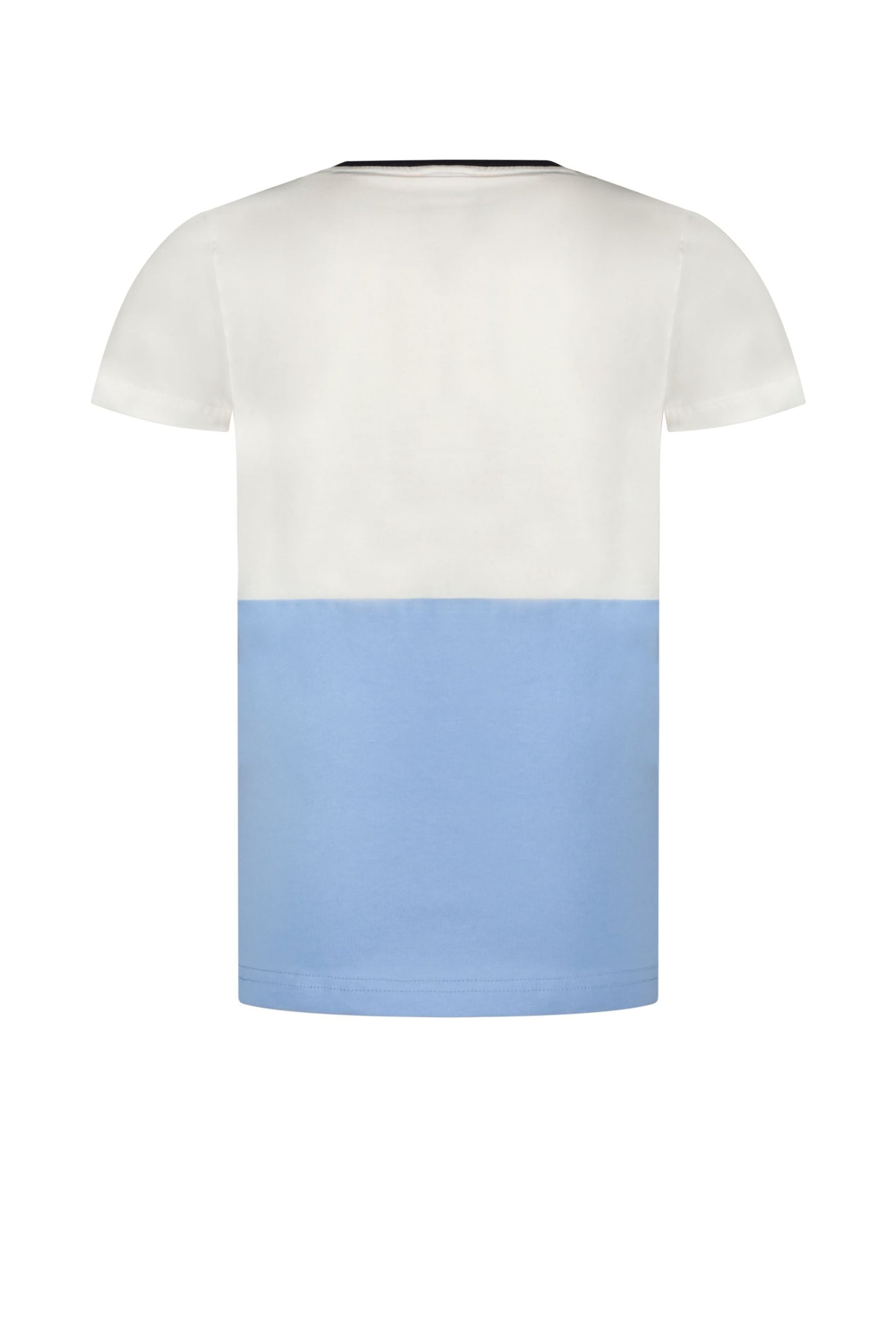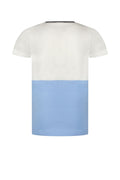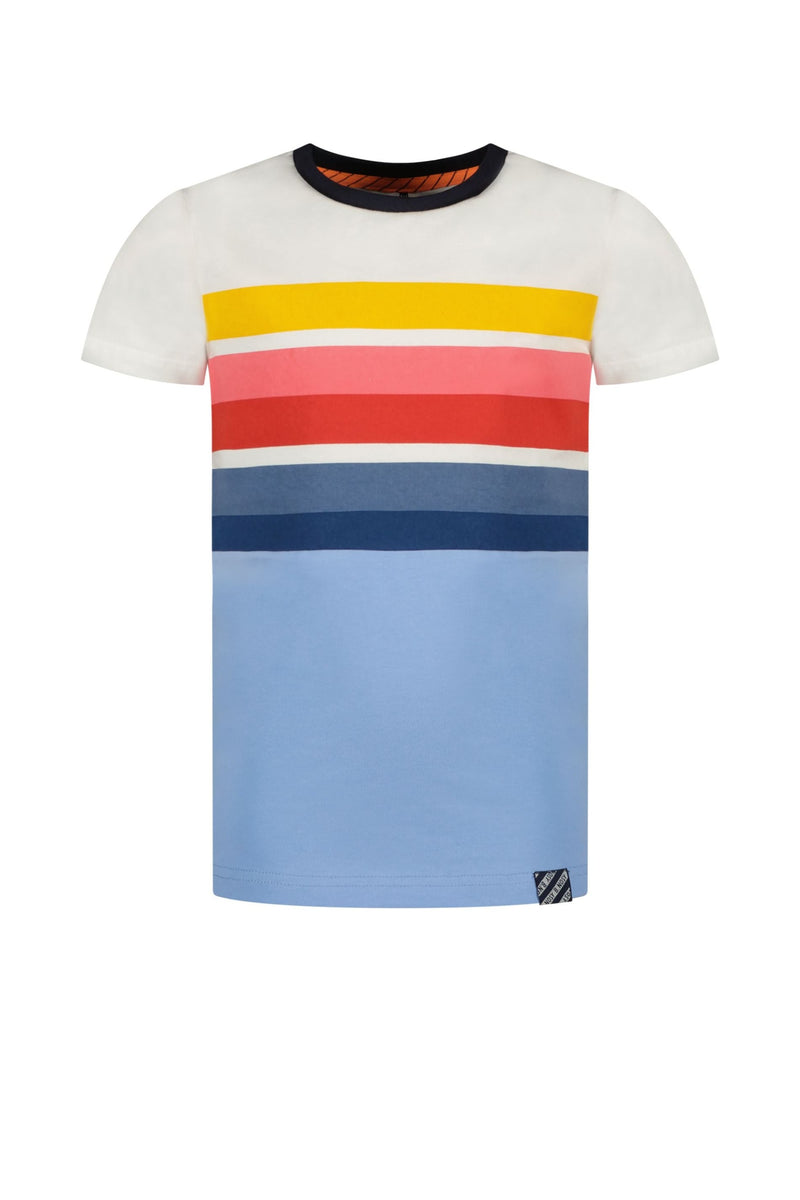 - T-shirt à manches courtes blanc et bleu avec lignes de couleur sur la poitrine.